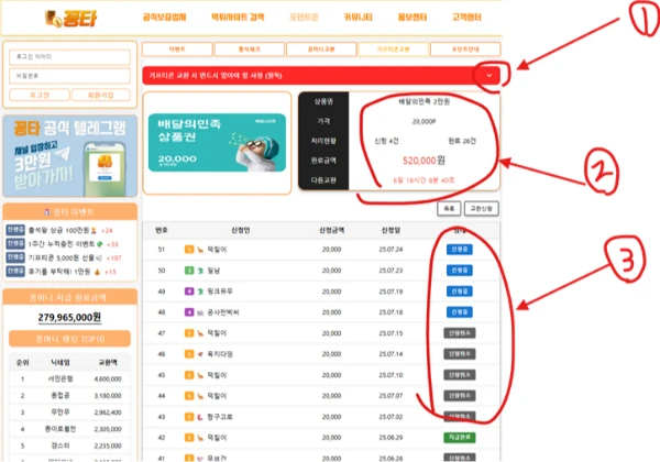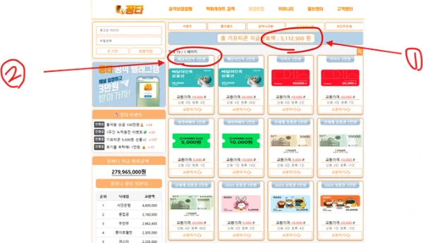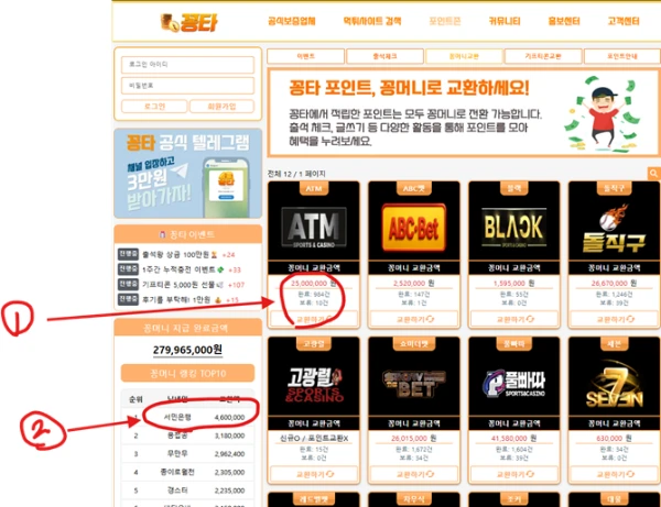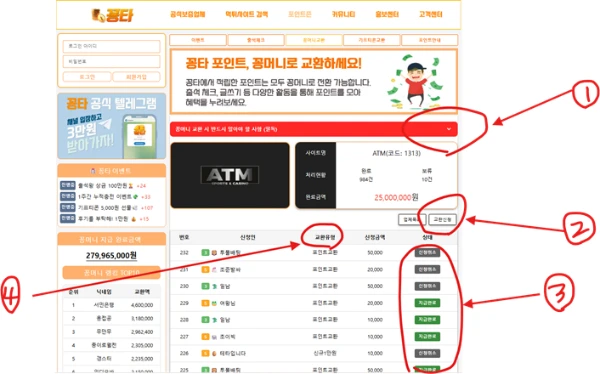 (사진 설명 : 꽁타사이트 꽁머니 교환페이지와 빨간색 동그라미와 숫자표기 )