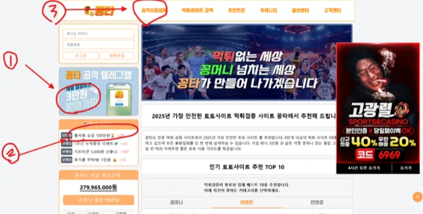 (사진 설명 : 꽁타사이트 메인화면과 빨간색 동그라미와 숫자표기 )