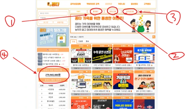 (사진 설명 : 꽁타사이트 이벤트 게시판 화면과 빨간색 동그라미와 숫자표기 )