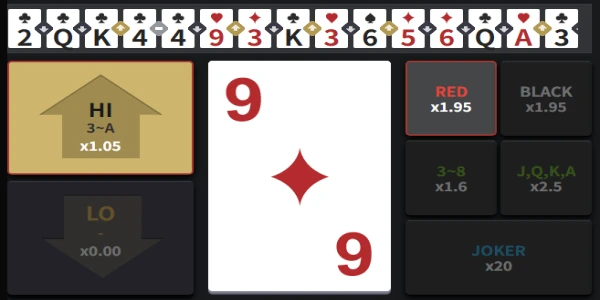 - 배당률 확인: 기준점 카드 숫자에 따라 하이/로우 배당률이 실시간으로 변동됩니다(예: 기준점 3 → 하이 배당률 높음).