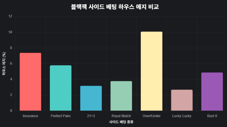 - 사이드 베팅의 정의와 작동 방식: 블랙잭에서 사이드 베팅은 메인 핸드 결과와 무관하게 독립적으로 정산됩니다. 예를 들어, 플레이어의 첫 두 장 카드가 특정 패턴(예: 페어)을 이루면 배당을 받습니다. 이는 게임 속도를 높이고, 작은 베팅으로 큰 배당을 노릴 수 있게 합니다. 제 권위 있는 출처인 Wizard of Odds 사이트에 따르면, 사이드 베팅의 하우스 에지는 보통 3%~10%로 메인 게임(0.5%~2%)보다 높지만, 변동성이 크다는 특징이 있습니다.