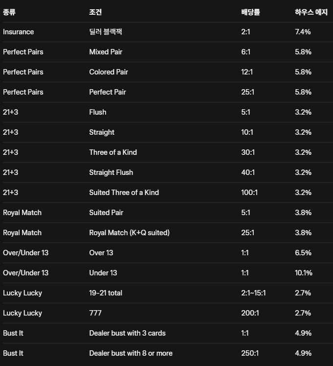 주요 블랙잭 사이드 베팅 종류 상세 분석