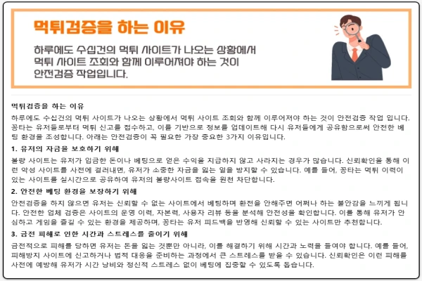 온라인 베팅 시장의 성장은 편리함과 동시에 먹튀사이트라는 위험을 야기했습니다. 먹튀사이트는 사용자들의 소중한 자산을 가로채는 불법적인 행위를 하며, 이는 단순한 금전적 손실을 넘어 정신적인 피해까지 줄 수 있습니다. 따라서 안전한 베팅 환경을 구축하고, 이러한 위험으로부터 자신을 보호하기 위한 안전한 먹튀사이트 검색 방법을 숙지하는 것은 이제 선택이 아닌 필수가 되었습니다. -토토가이드 다른 콘텐츠 보러가기-