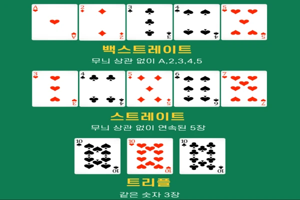 - 스트레이트(Straight): 연속된 숫자 5장. 예: 4♠-5♥-6♦-7♣-8♠. A는 10-J-Q-K-A 또는 A-2-3-4-5로 사용 가능.