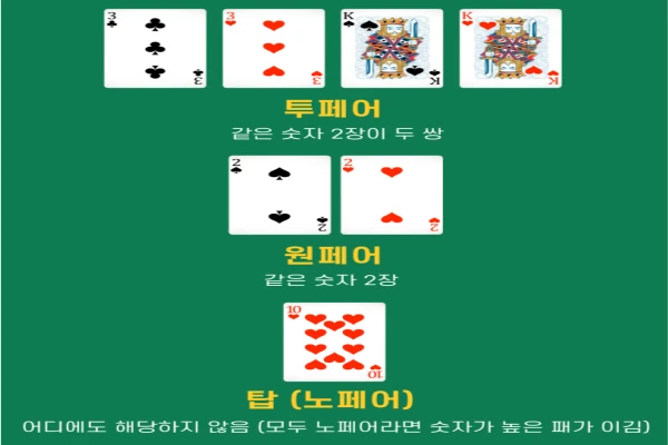 - 투페어(Two Pair): 두 쌍의 페어. 예: J♠-J♥-5♦-5♣.