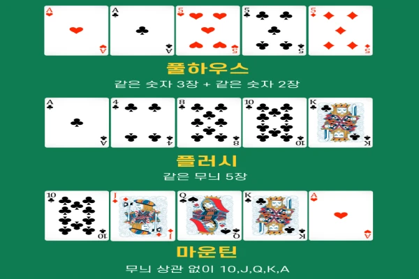 - 플러시(Flush): 같은 무늬 5장. 예: 다이아 A-5-7-9-K. 숫자가 높을수록 강함.