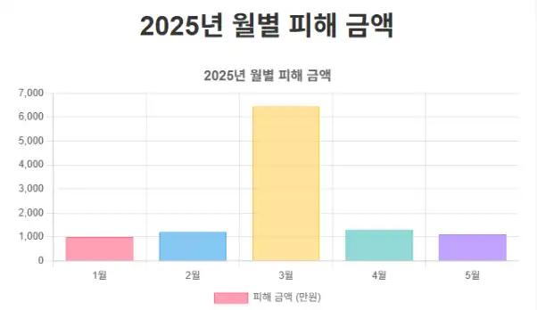 위 그래프는 2025년 1월부터 5월까지 월별 피해 금액을 보여준다. 3월에 6460만 원으로 피해가 가장 컸으며, 평균 피해 금액은 1500만 원 수준이다.