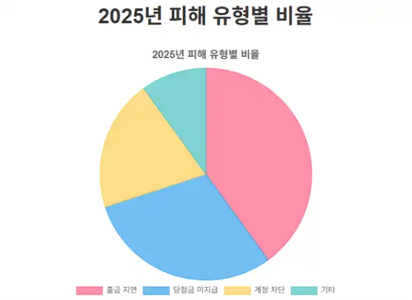 위 그래프는 2025년 1월부터 5월까지 피해 유형을 보여준다. 출금 지연이 40%로 가장 많았고, 당첨금 미지급이 30%, 계정 차단이 20%로 뒤를 이었다.